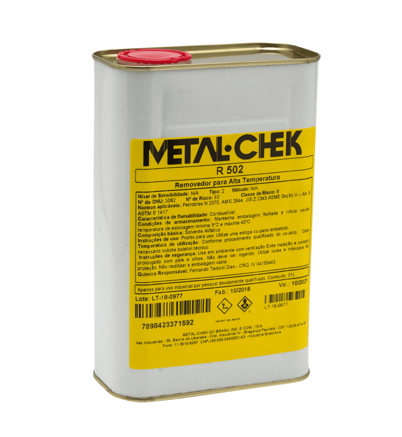 O Metal-Chek R 502 é um removedor à base de solvente orgânico, pronto para uso, desenvolvido especificamente para a limpeza e remoção do excesso de líquido penetrante em superfícies com temperatura elevada, entre 52°C e 120°C. Ele é ideal para materiais como metais ferrosos e não ferrosos, aços inoxidáveis, titânio, ligas de níquel, cerâmica não porosa, vidros e plásticos. Produto destinado a uso industrial por profissionais qualificados no método de ensaio.